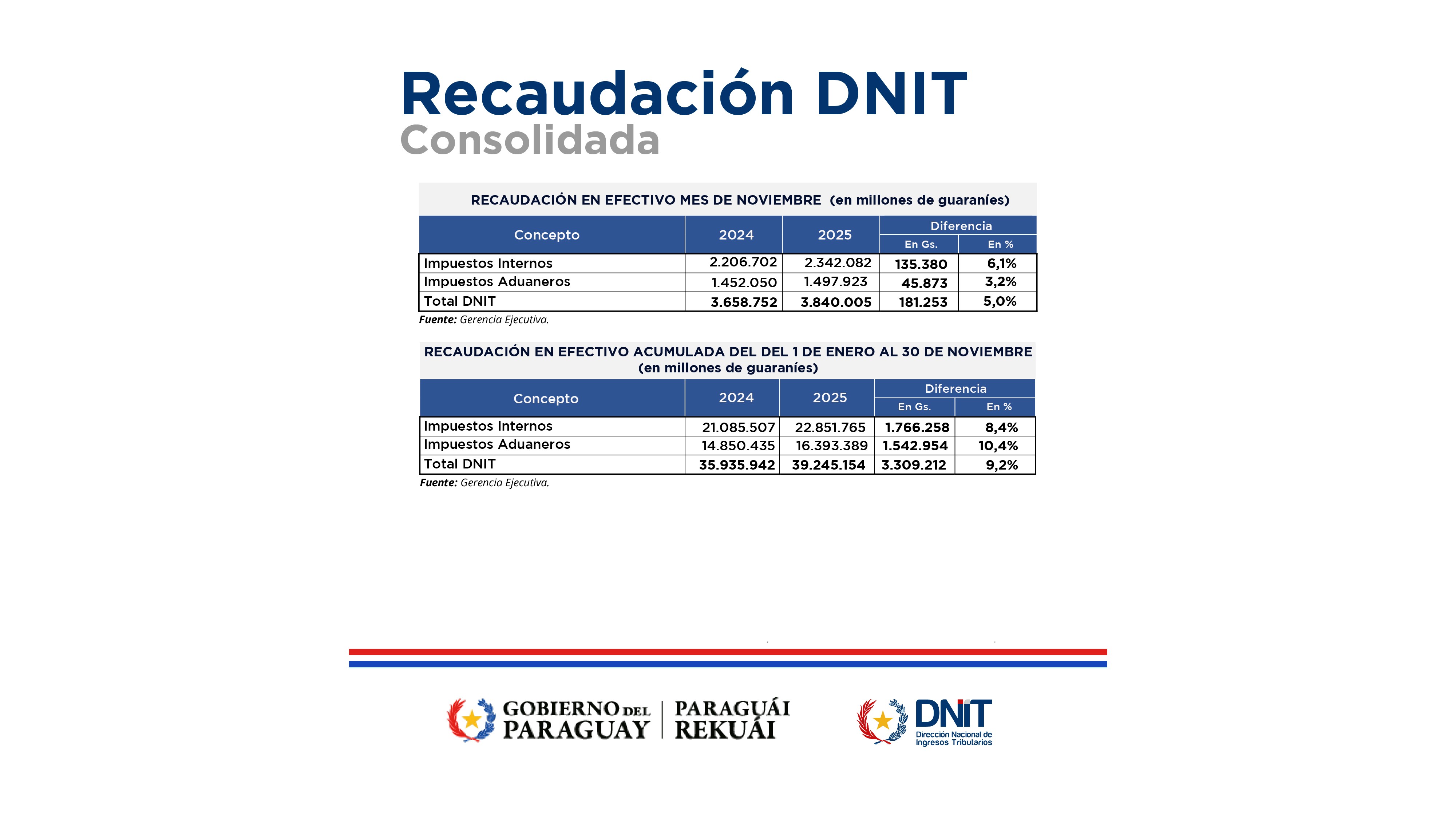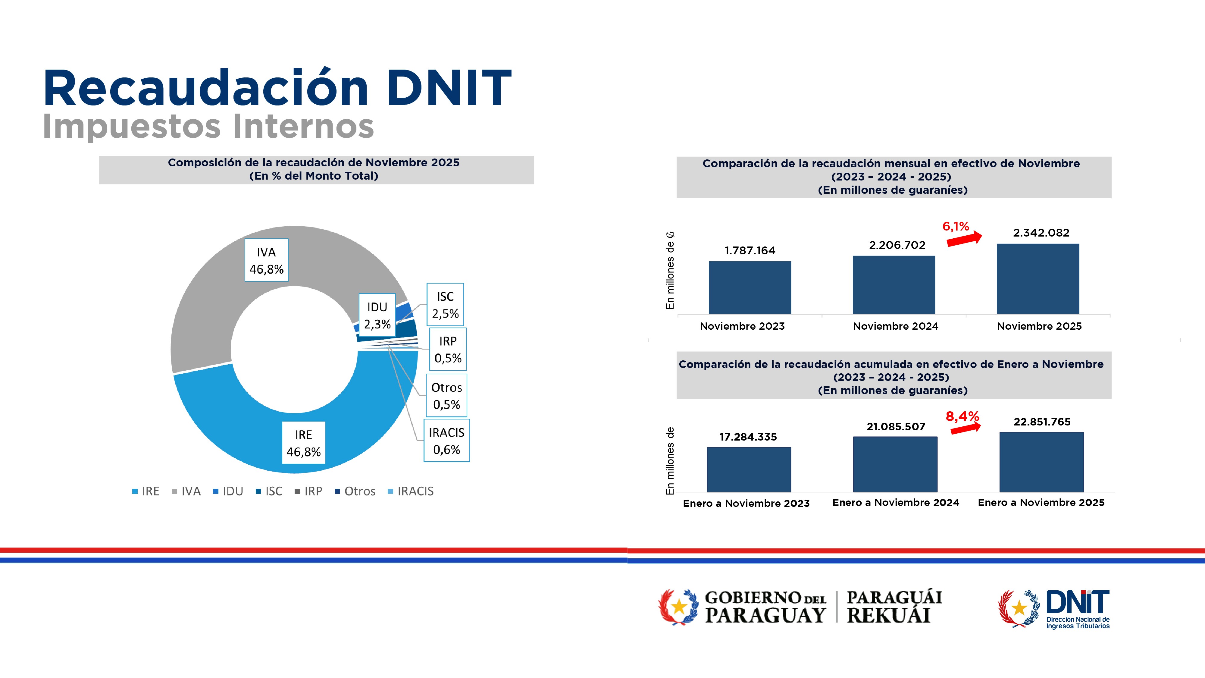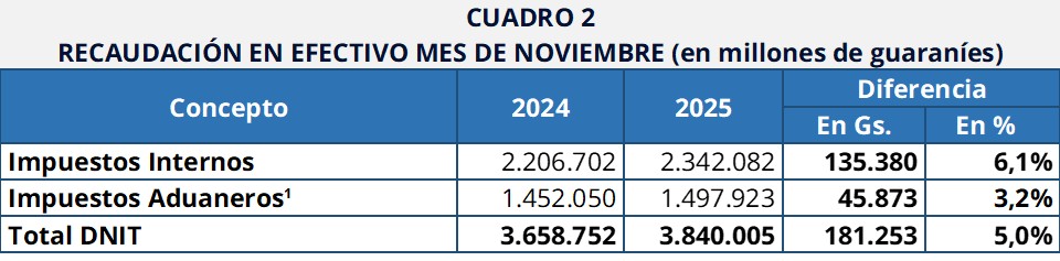 En el mes de noviembre, la DNIT recaudó 3.840.005 millones (550,0 millones de USD)1, lo cual representa un crecimiento de 5,0% en comparación al mismo mes del año pasado, obteniendo 181.253 millones más (USD 26,0 millones)1 que, en noviembre de 2024, conforme se visualiza en el Cuadro 2: