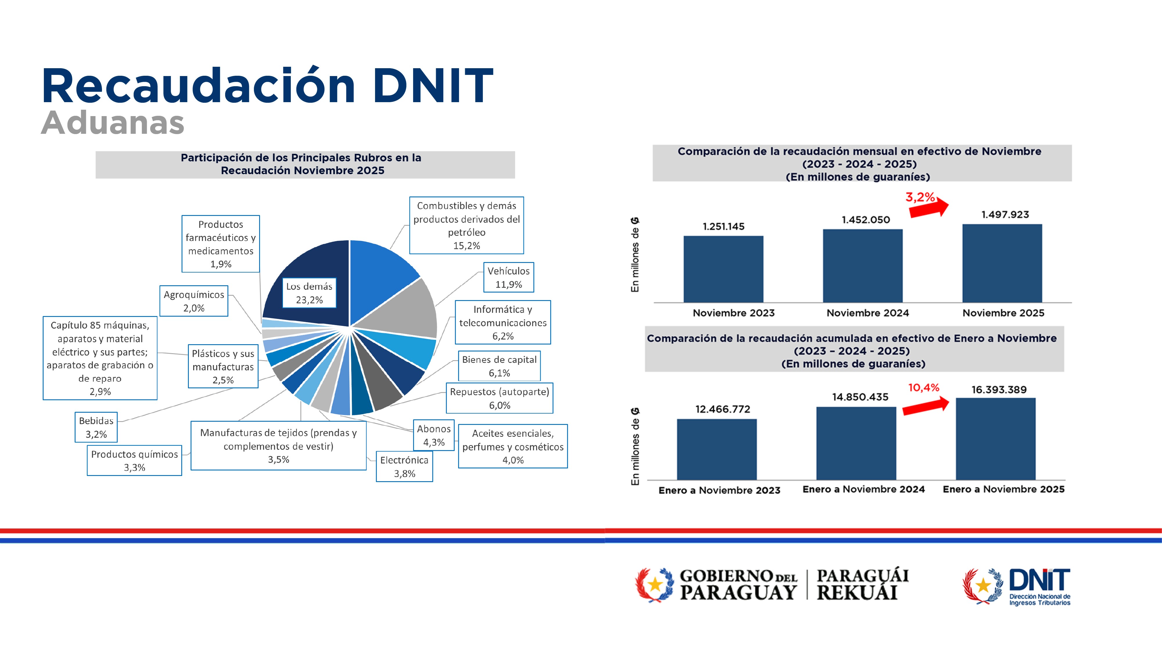 La Gerencia General de Aduanas por su parte en el mes de noviembre alcanzó una recaudación en efectivo de . 1.497.923 millones (USD 214,5 millones), obteniendo una variación interanual de 3,2% respecto al mismo mes del año anterior, equivalente a 45.873 millones (USD 6,6 millones) más.