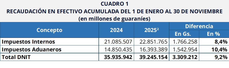 La Recaudación Acumulada (enero a noviembre) de la DNIT, presentó un crecimiento de 9,2%, que representa un monto total de ₲. 3.309.212 millones (aproximadamente USD 474 millones) más que en el mismo periodo del 2024, conforme se puede observar en el Cuadro 1: