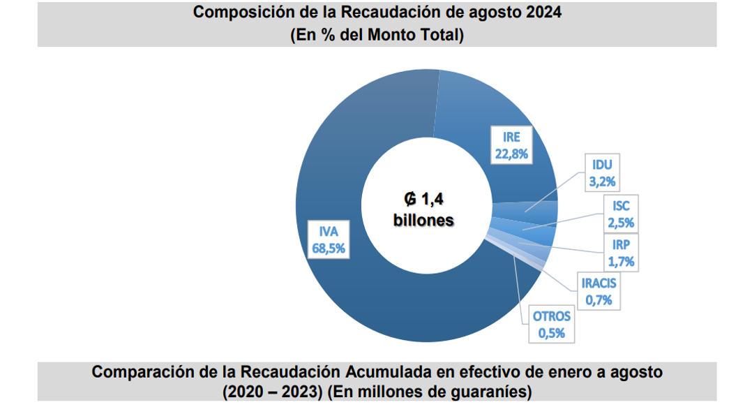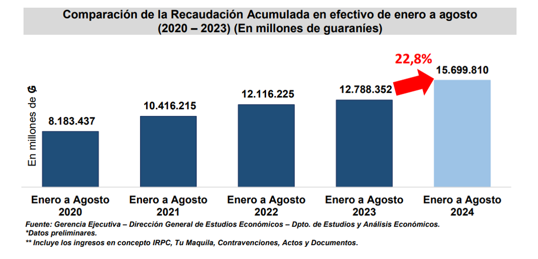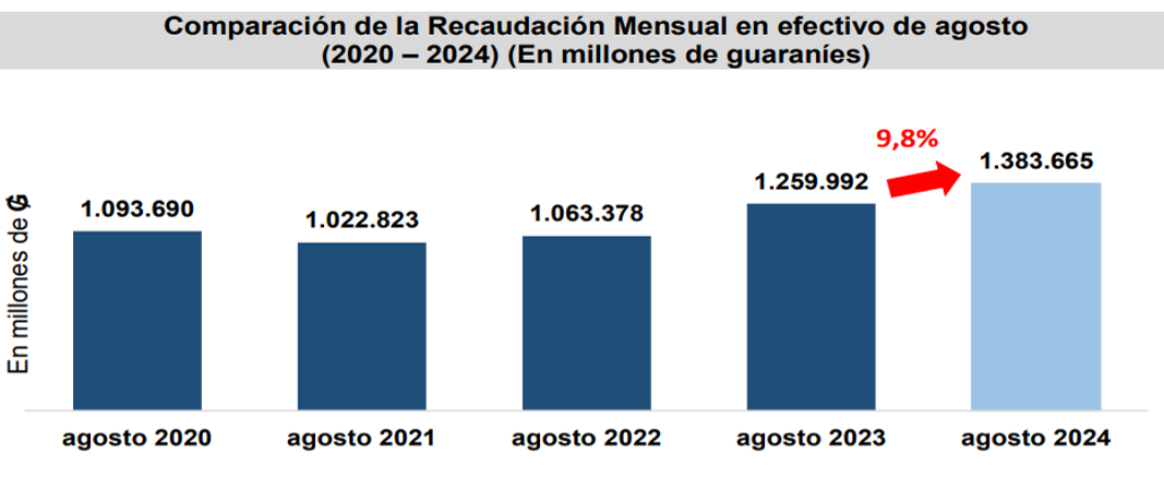 La Gerencia General de Impuestos Internos en el mes de agosto recaudó un total de ₲. 1.383.665 millones (USD 180 millones), que representa una variación interanual de 9,8%, equivalente a ₲ 123.673 millones (USD 16,1 millones) más.