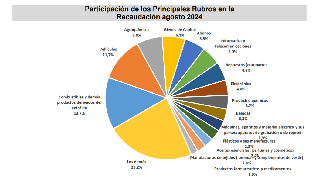 La Gerencia General de Aduanas por su parte registra en el mes de agosto pasado una recaudación en efectivo de ₲. 1.314.215 millones (USD 171 millones), obteniendo una variación interanual de 8,0% respecto al mismo mes del año anterior, equivalente a ₲. 97.407 millones (USD 12,7 millones) más.
