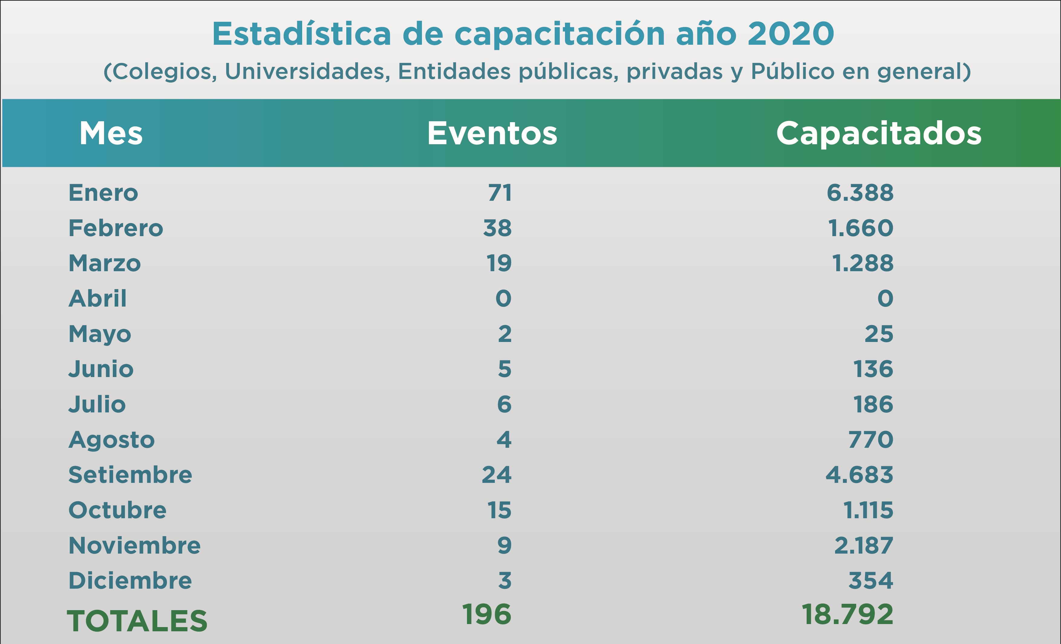 Estadística de Capacitación a Colegios, Universidades, Entidades Públicas, Privadas y Público en General Año 2020