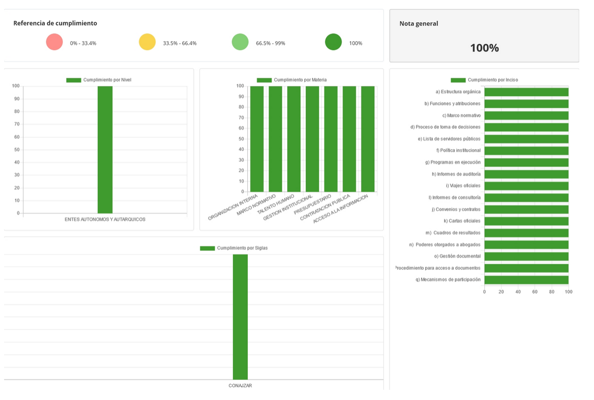 En el marco de las gestiones realizadas por esta dependencia para avanzar en la aplicación de políticas de transparencias, la CONAJZAR comunica que recibió 100% como calificación en cumplimiento de la Ley 5282/14 “De libre acceso ciudadano a la información pública y transparencia gubernamental”, según revisión realizada por la Secretaría Nacional Anticorrupción (SENAC), correspondiente a los periodos Abril y Mayo 2022.
