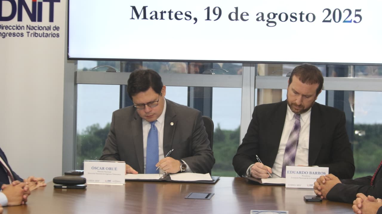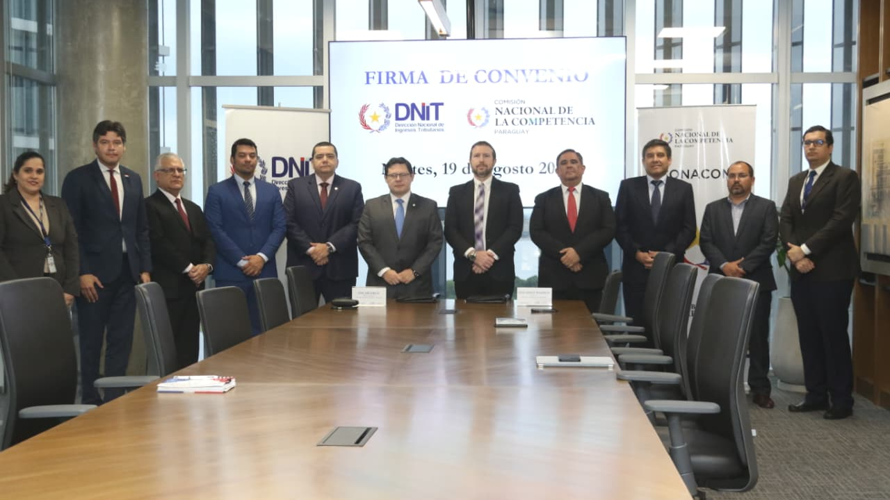La Dirección Nacional de Ingresos Tributarios (DNIT) y la Comisión Nacional de la Competencia (CONACOM) firmaron este martes 19 de agosto un convenio de cooperación interinstitucional. El acuerdo busca establecer un marco de coordinación entre ambas instituciones, con el fin de lograr una labor más eficiente y efectiva en el desarrollo y aplicación de políticas y procedimientos que faciliten el intercambio de información y el control del cumplimiento de las obligaciones.