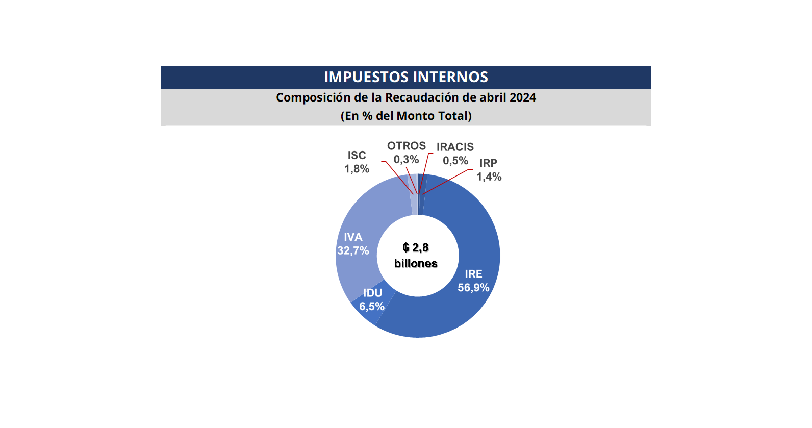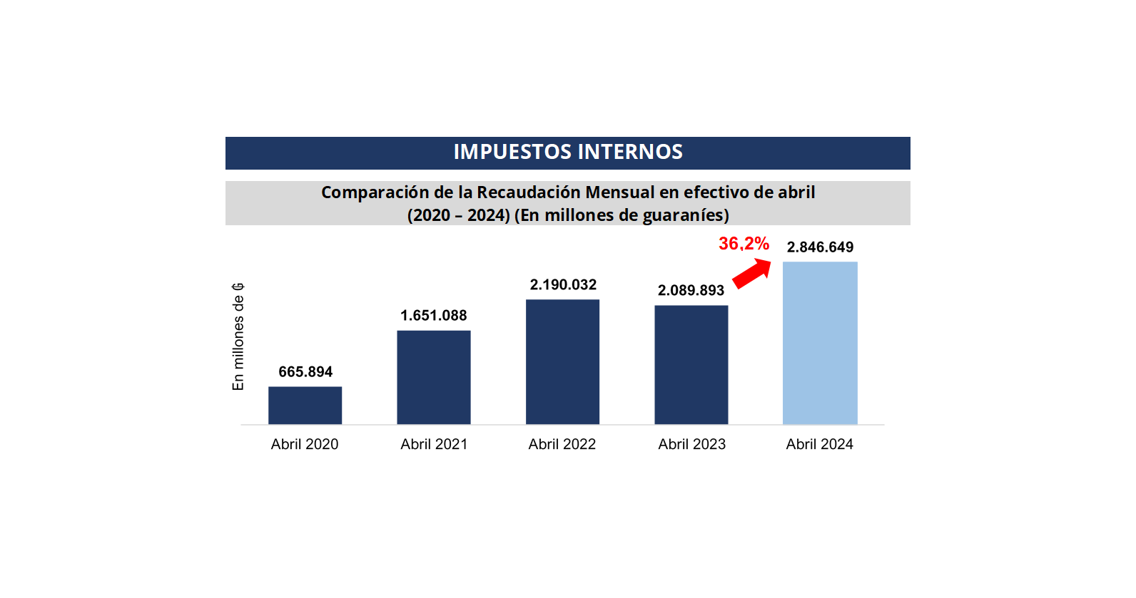 La Gerencia General de Impuestos Internos en el mes de abril recaudó un total de ₲. 2.846.649 millones (USD 380 millones1), que representa una variación interanual de 36,2%, equivalente a ₲ 756.756 millones (USD 100,9 millones) más.