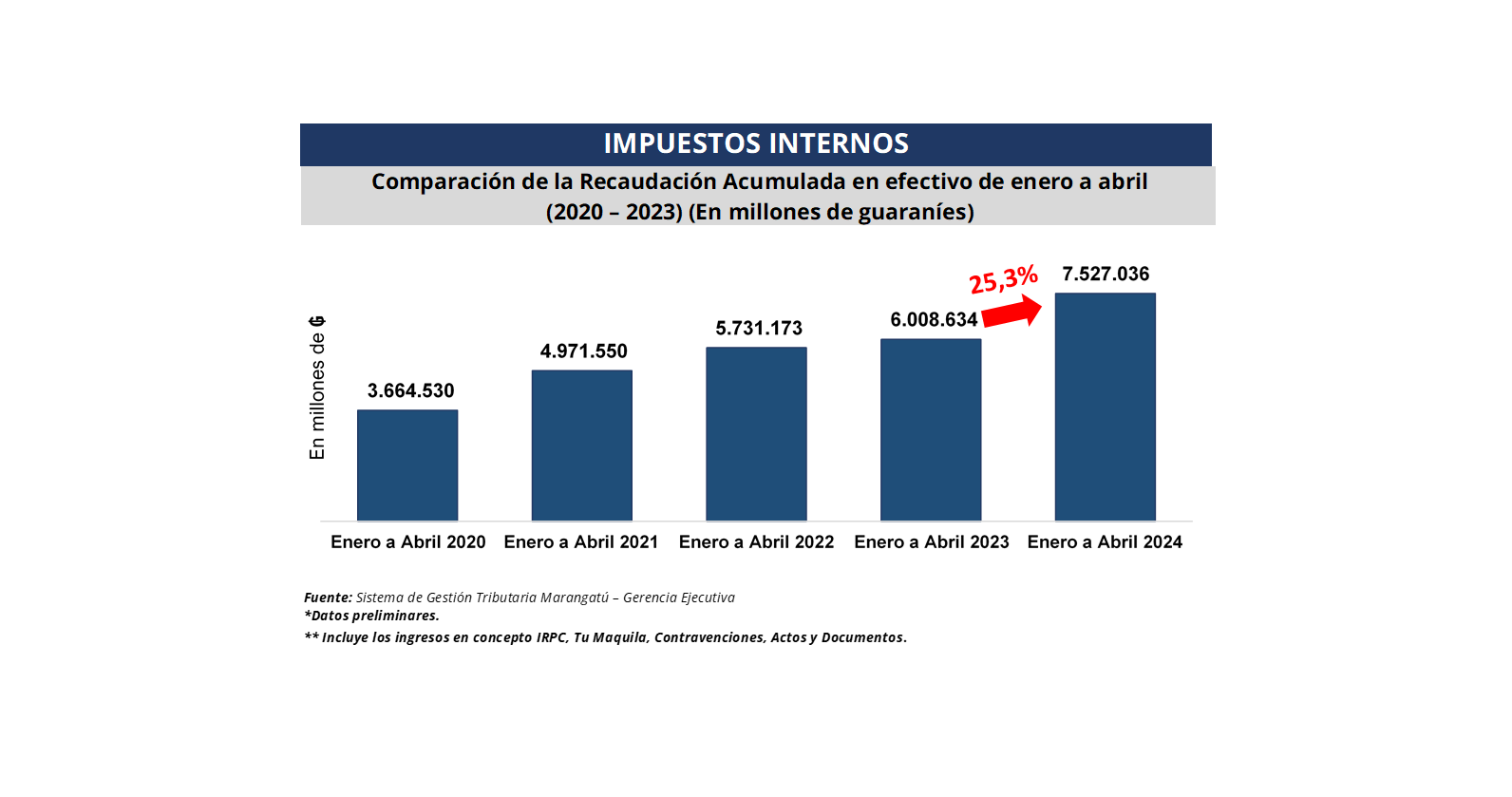 En términos de recaudación total acumulada de enero a abril se generó un crecimiento del 25,3%, que representa un monto total de ₲. 2.472.905 millones (USD 329,7 millones) más que en el primer cuatrimestre de 2023.