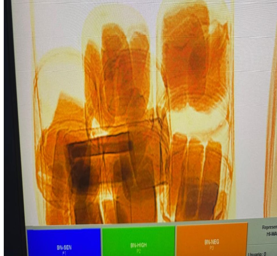 El escaneo no intrusivo reveló la imagen de material orgánico dentro del bulto, motivo por el cual se procedió a la verificación física correspondiente. En su interior se detectaron 7,8 kilos de una sustancia vegetal sospechosa. La intervención se realizó con apoyo de agentes de la Secretaría Nacional Antidrogas (SENAD) y de Lala, el can antidrogas, que reaccionó de forma positiva ante la presencia de estupefacientes.