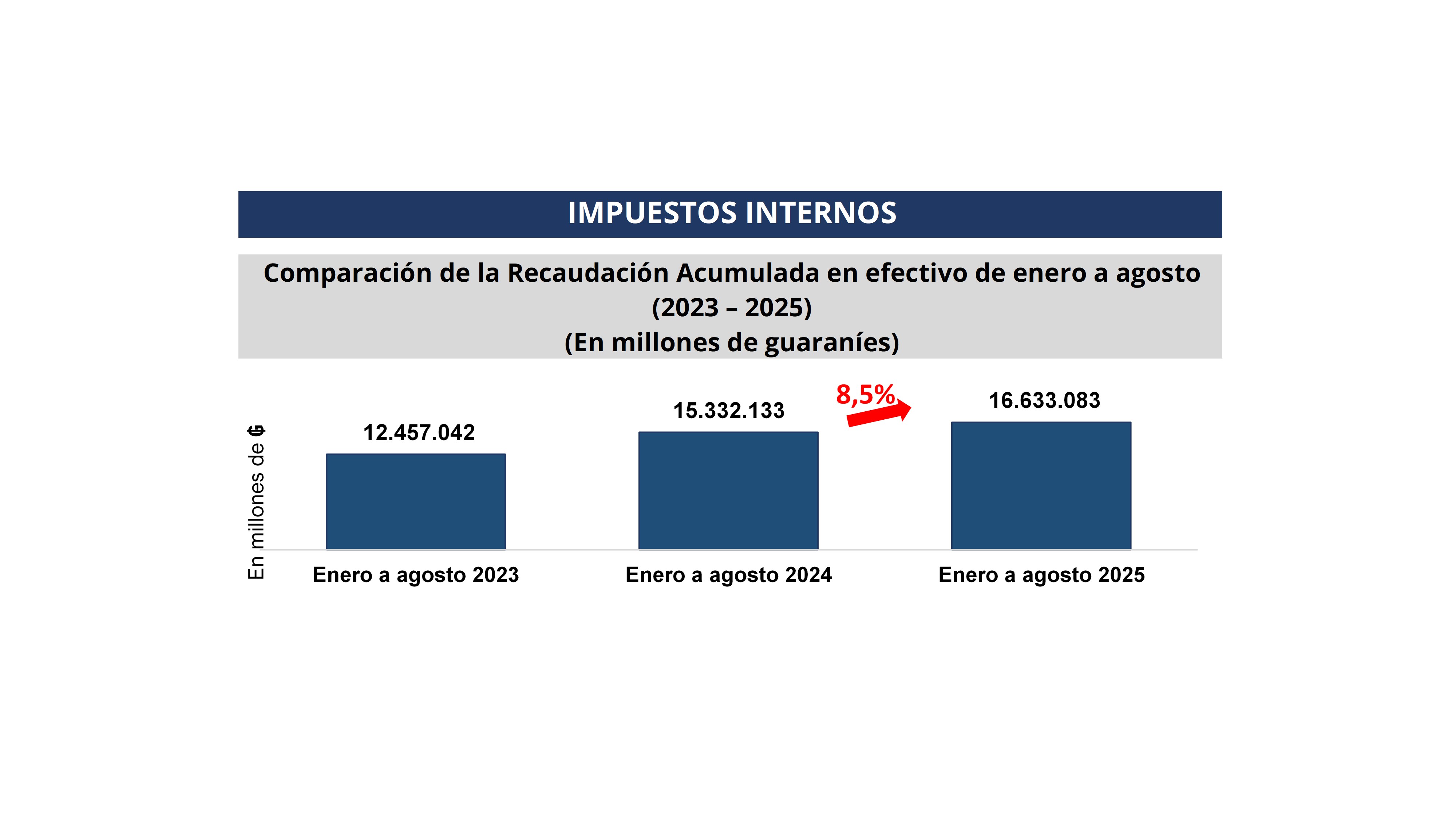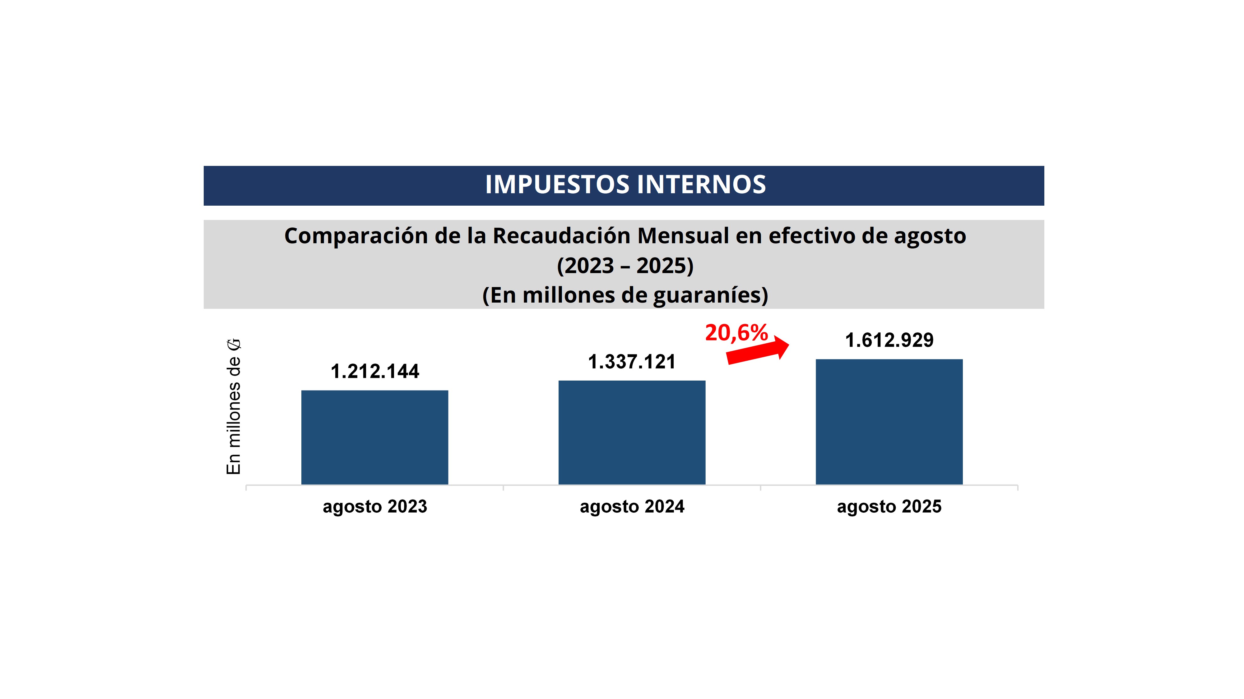 La Gerencia General de Impuestos Internos en el mes de agosto recaudó un total de ₲. 1.612.929 millones (USD 220,1 millones1), que representa una variación interanual de 20,6%, equivalente a ₲ 275.808 millones (USD 37,6 millones) más.