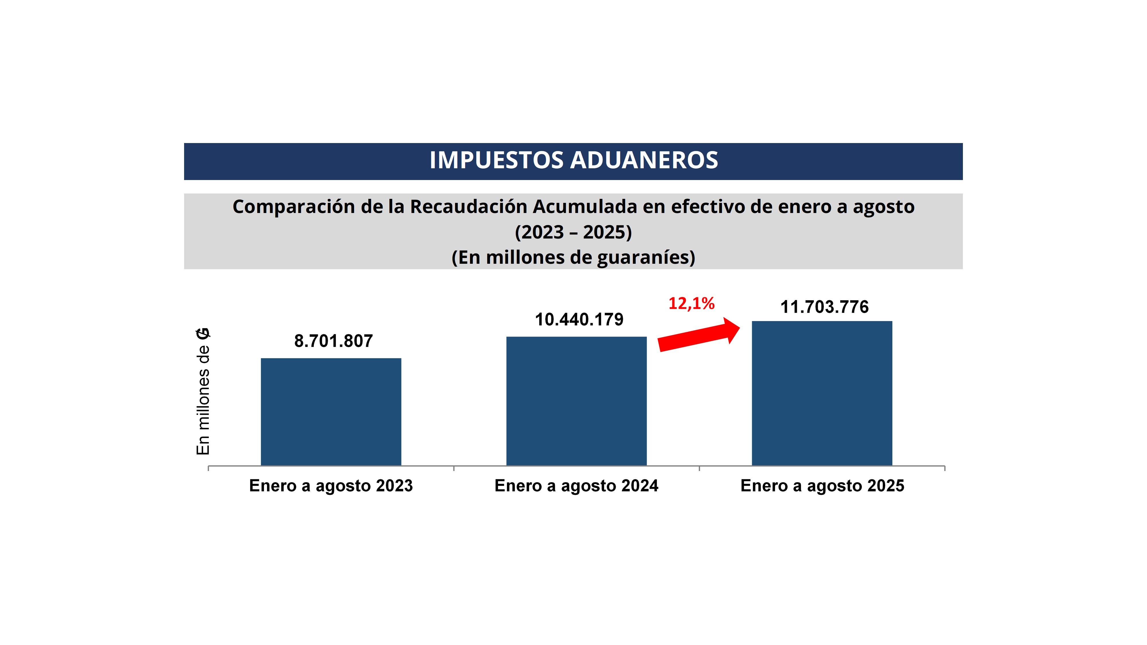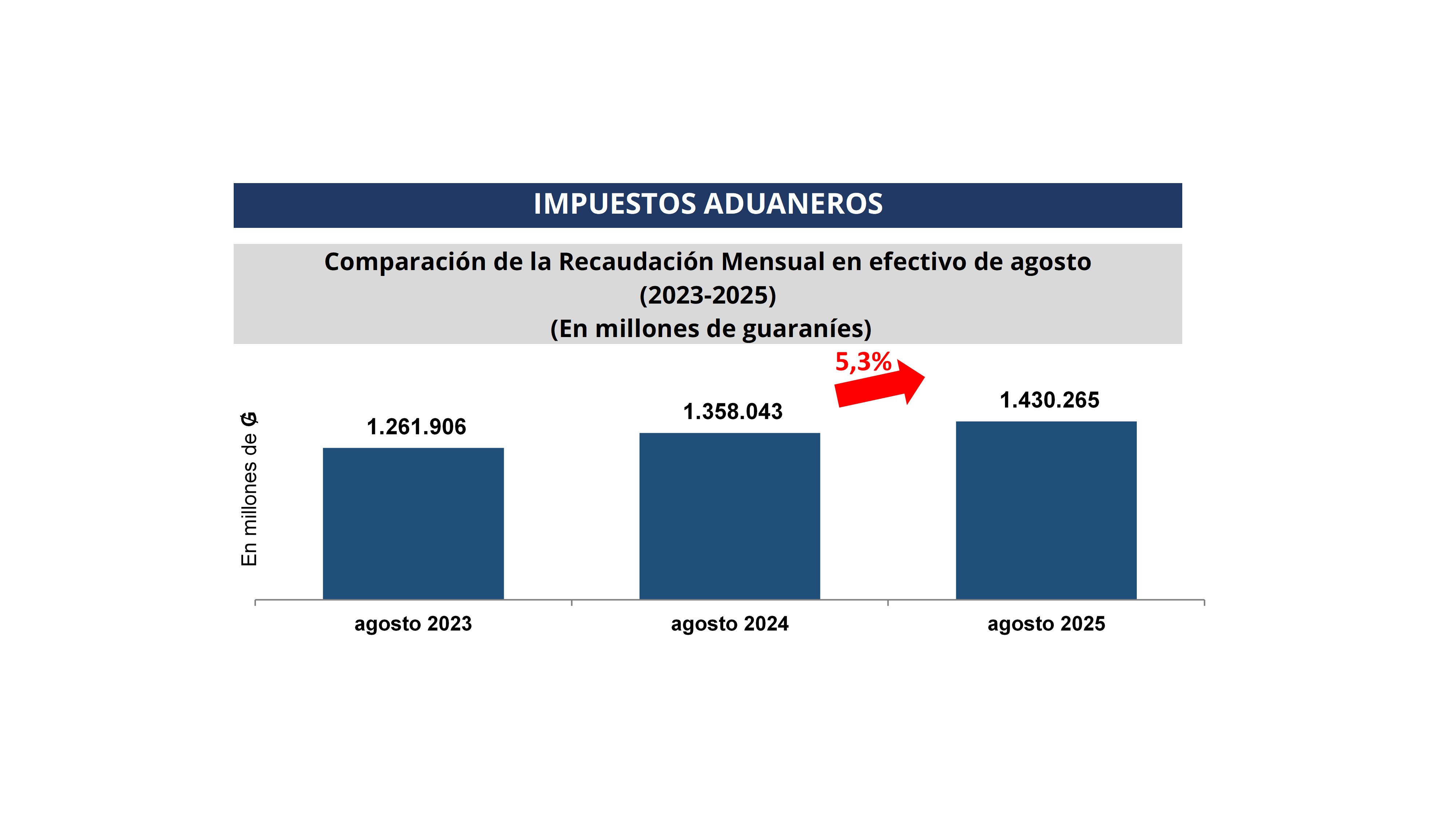 La Gerencia General de Aduanas por su parte en el mes de agosto alcanzó una recaudación en efectivo de ₲. 1.430.265 millones (USD 195,2 millones), obteniendo una variación interanual de 5,3% respecto al mismo mes del año anterior, equivalente a ₲ 72.222 millones (USD 9,9 millones) más.