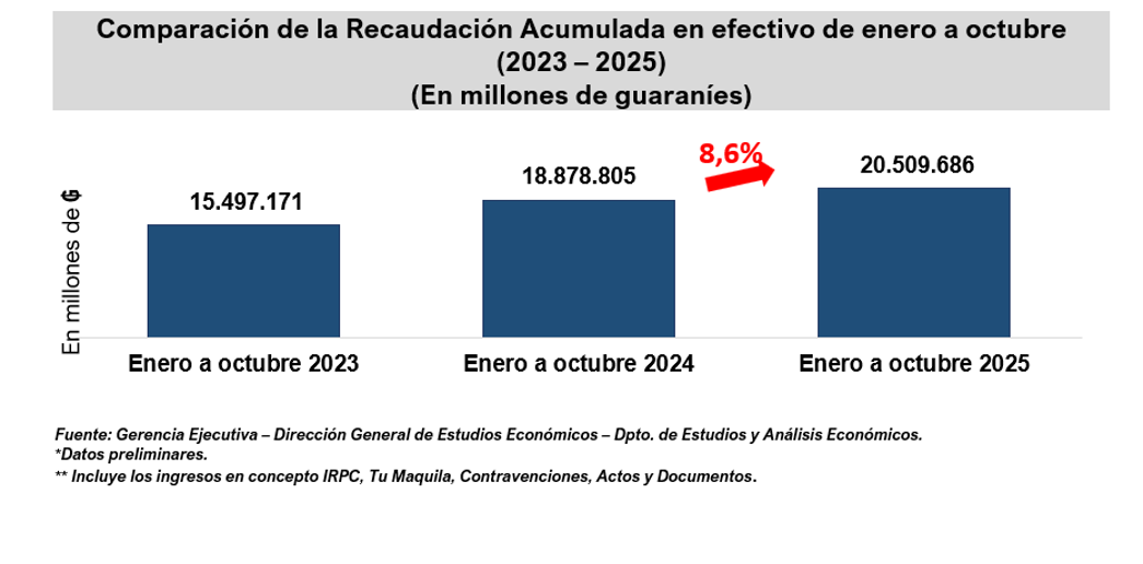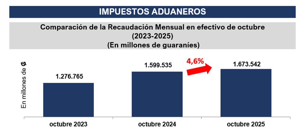 La Gerencia General de Aduanas por su parte en el mes de octubre alcanzó una recaudación en efectivo de ₲. 1.673.542 millones (USD 235,5 millones), obteniendo una variación interanual de 4,6% respecto al mismo mes del año anterior, equivalente a ₲ 74.006 millones (USD 10,4 millones) más. Se observa un menor crecimiento de los esperado debido al impacto del tipo de cambio en dólares americanos.