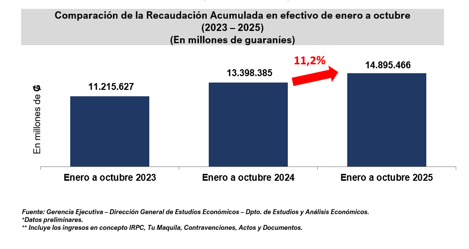 En términos de recaudación total acumulada de enero a octubre, se generó un crecimiento de 9,7%, que representa un monto total de ₲. 3.127.962 millones más que en el mismo periodo del 2024, conforme se puede observar en el Cuadro 2: