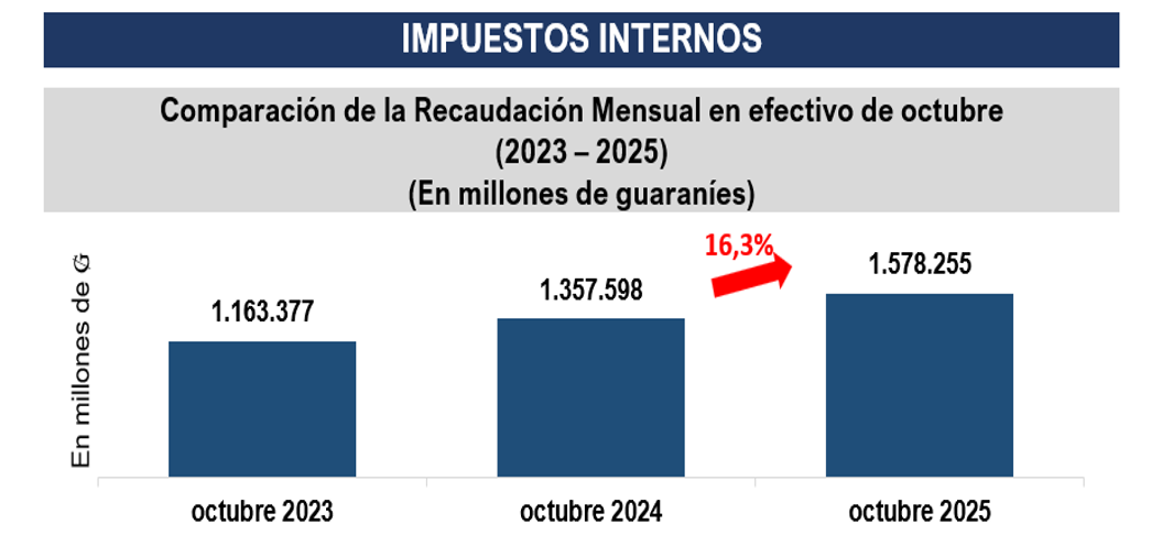 La Gerencia General de Impuestos Internos en el mes de octubre recaudó un total de ₲. 1.578.255 millones (USD 222,1 millones1), que representa una variación interanual de 16,3%, equivalente a ₲ 220.657 millones (USD 31,1 millones) más.