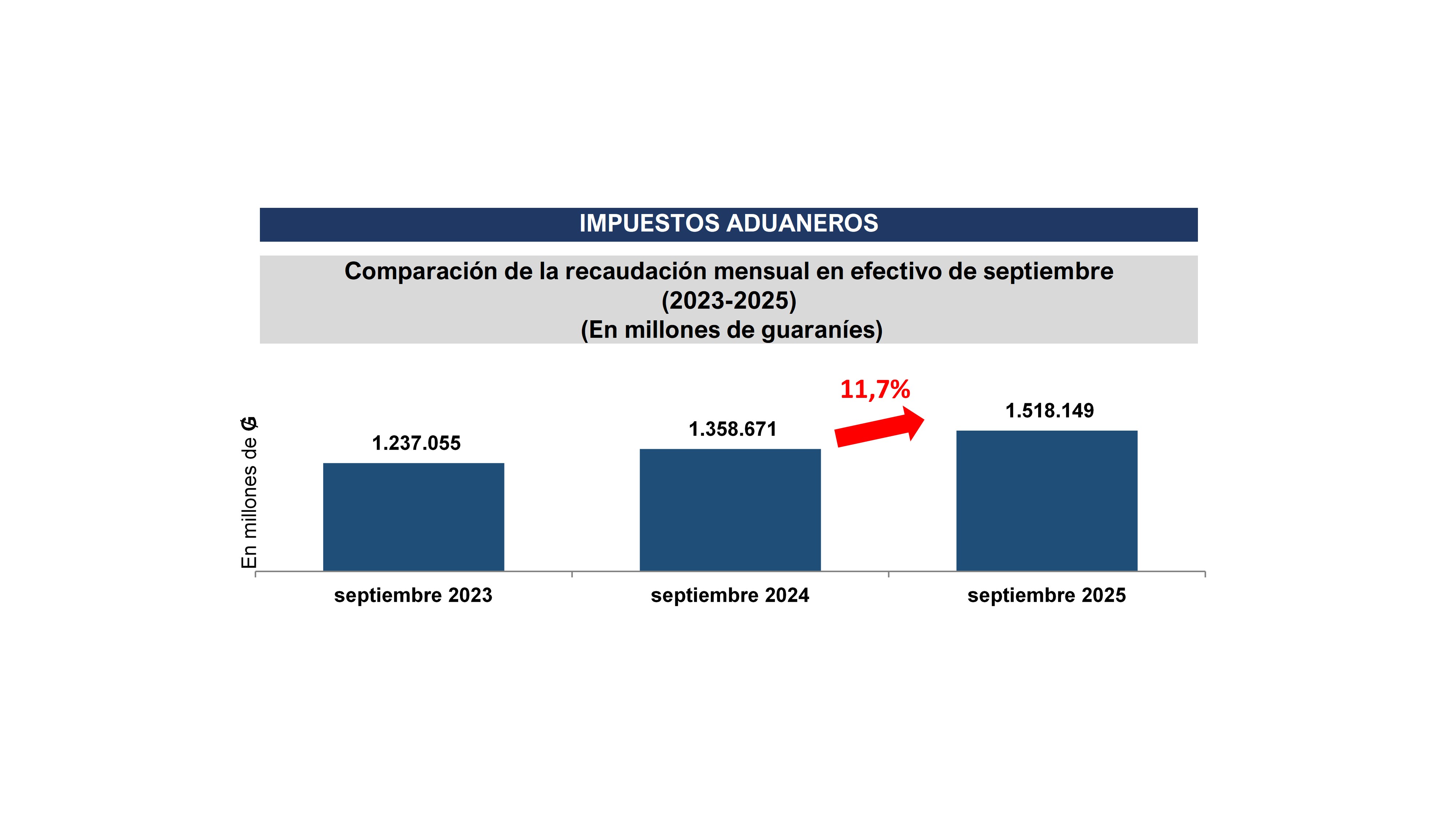 La Gerencia General de Aduanas por su parte en el mes de septiembre alcanzó una recaudación en efectivo de ₲. 1.518.149 millones (USD 216,8 millones), obteniendo una variación interanual de 11,7% respecto al mismo mes del año anterior, equivalente a ₲ 159.478 millones (USD 22,8 millones) más.