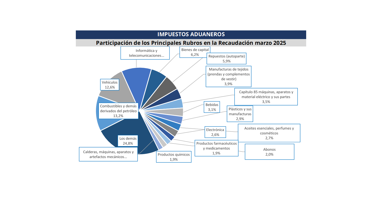 La Gerencia General de Aduanas por su parte en el mes de marzo alcanzó una recaudación en efectivo de . 1.325.007 millones (USD 166 millones), obteniendo una variación interanual de 13,1% respecto al mismo mes del año anterior, equivalente a 153.436 millones (USD 19,2 millones) más.