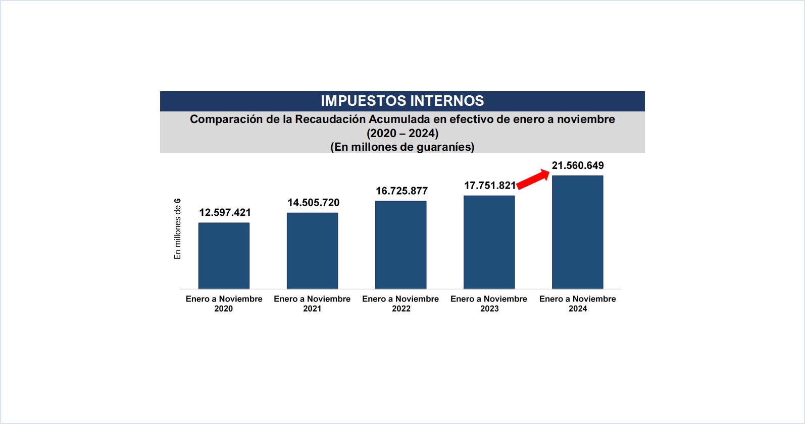 La Gerencia General de Impuestos Internos en el mes de noviembre recaudó un total de ₲. 2.237.773 millones (USD 287 millones), que representa una variación interanual de 22,1%, equivalente a ₲ 405.563 millones (USD 52,0 millones) más.