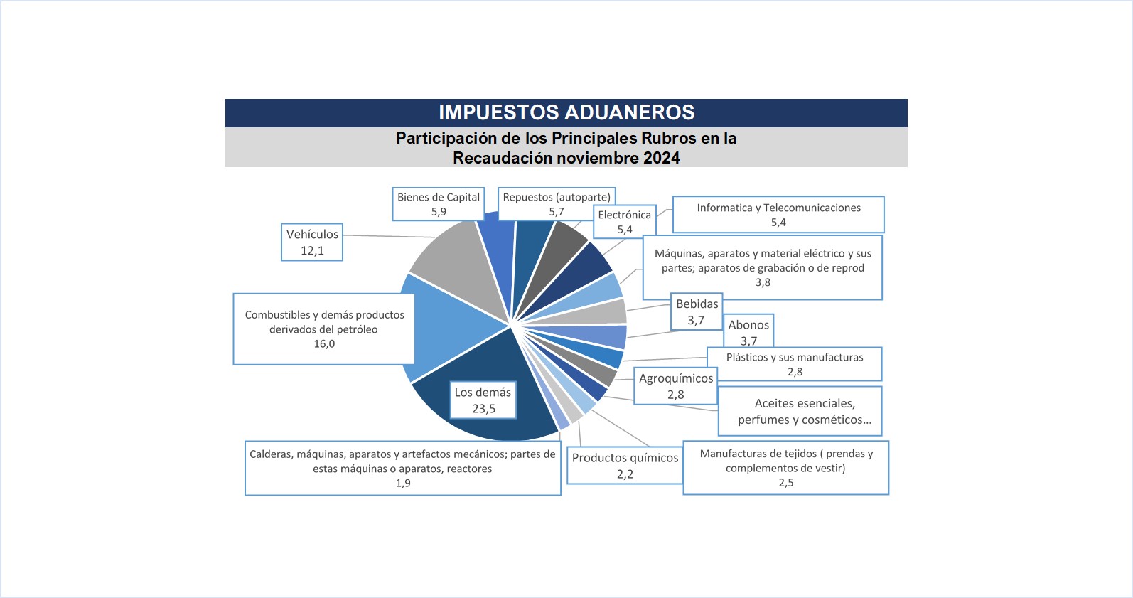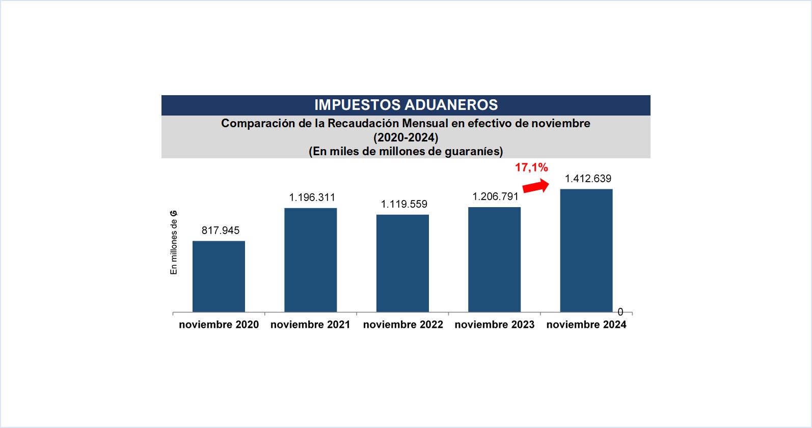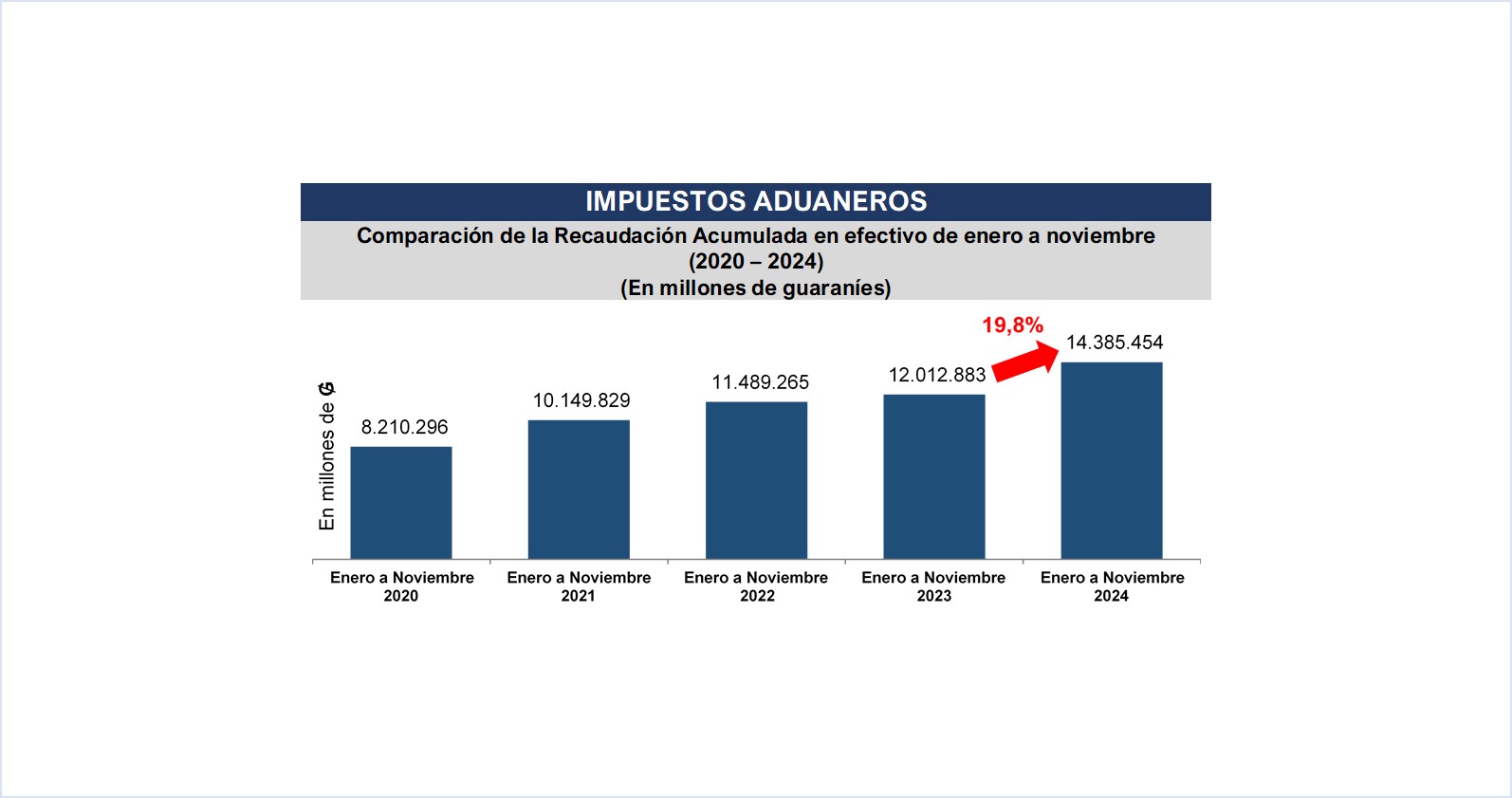 La Gerencia General de Aduanas por su parte en el mes de noviembre alcanzó una recaudación en efectivo de ₲. 1.412.639 millones (USD 181 millones), obteniendo una variación interanual de 17,1% respecto al mismo mes del año anterior, equivalente a ₲ 205.848 millones (USD 26,4 millones) más.